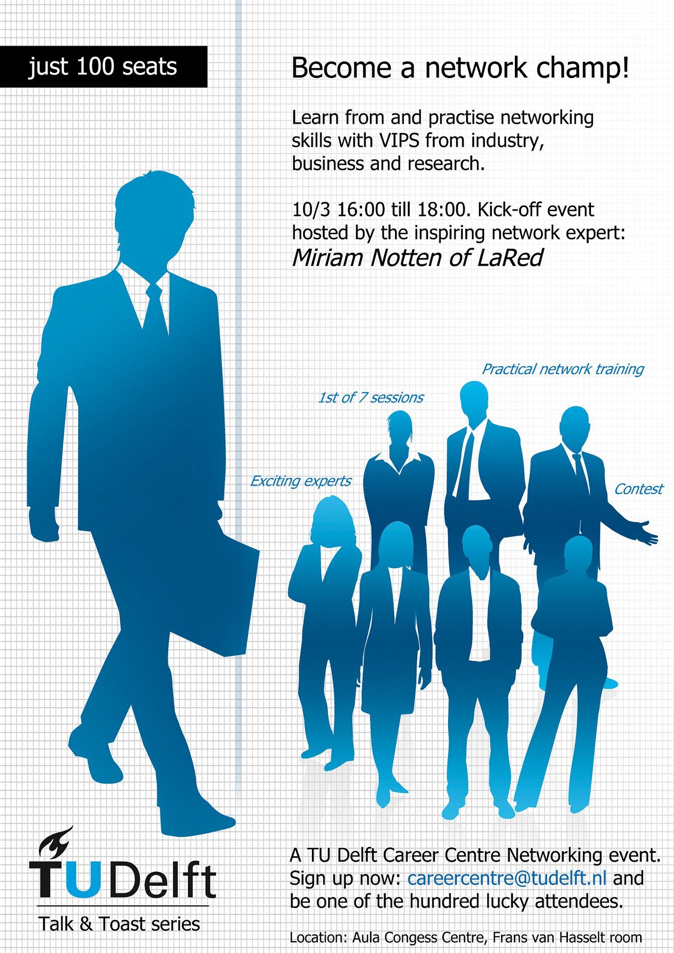 La Red faciliteert voor het TU Delft Career center een aantal bijeenkomsten, Talk & Toast genaamd. Deze bijeenkomsten zijn gericht op ontmoetingen tussen studenten en professionals. Deze reeks bijeenkomsten wordt op 10 maart afgetrapt met een speciale kick-off. Miriam Notten zal deze dag een training in netwerkvaardigheden geven, en deze kunnen meteen geoefend worden met een aantal ‘Mystery Guests’.