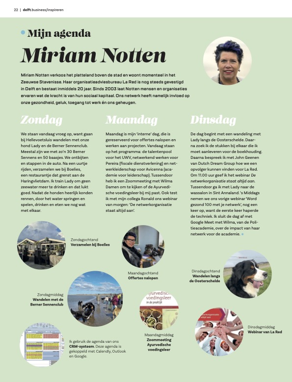 Miriam verkoos het platteland boven de stad en woont momenteel in Stavenisse. Ze wandelt graag met haar hond Lady, voert werkzaamheden uit voor La Red en besteedt dagelijks tijd aan het uitbreiden en onderhouden van haar netwerk.