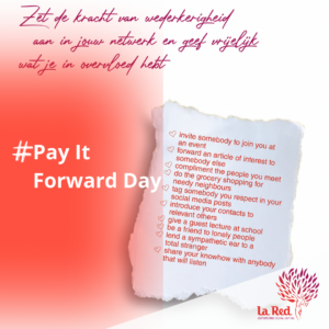 Wist je dat we met La Red aangesloten zijn bij de mondiale beweging Pay-it-forward? We nodigen je dan ook van harte uit om vandaag iets fijns te doen voor iemand anders. Dat kan iets praktisch zijn zoals koffie halen voor je collega of een goede vriend(in) uitnodigen voor een mooi evenement, maar een luisterend oor bieden of emotionele steun kan net zo goed.