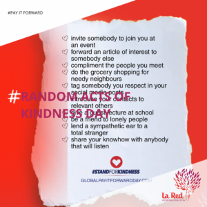 Speciaal voor jou heeft La Red de ‘Pay it forward kaart’ gemaakt om je op weg te helpen met ideeën van random acts of kindness. Je kunt de kaart nu gratis downloaden.